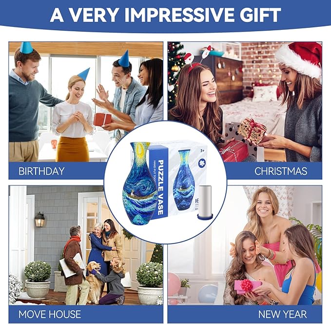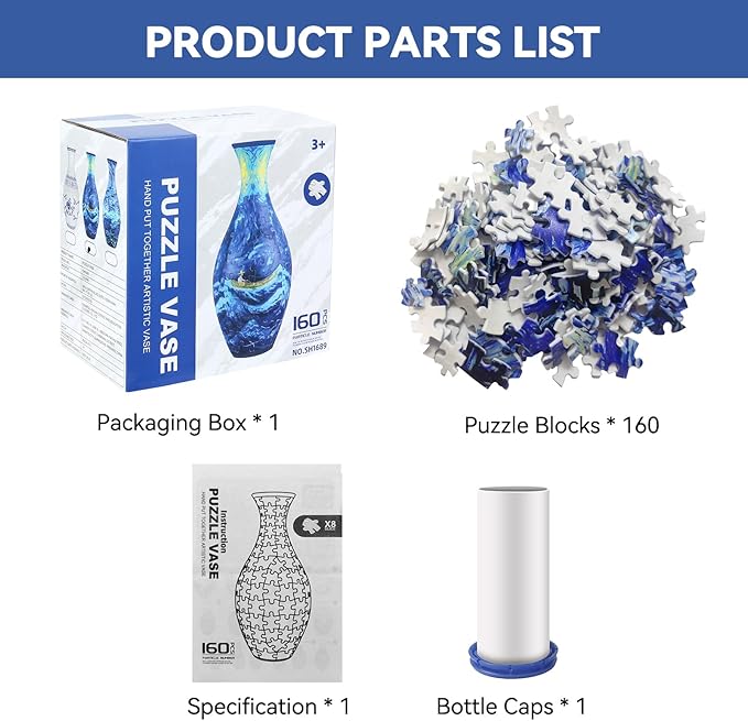 Unique 3D Flower Vase:Made by 160-piece 3d curved puzzle pieces with a water column.The finished vase size is 4.3 inches in diameter and 9.6 inches in height.An ideal choice for those seeking challenging and educational 3D puzzles for adults.