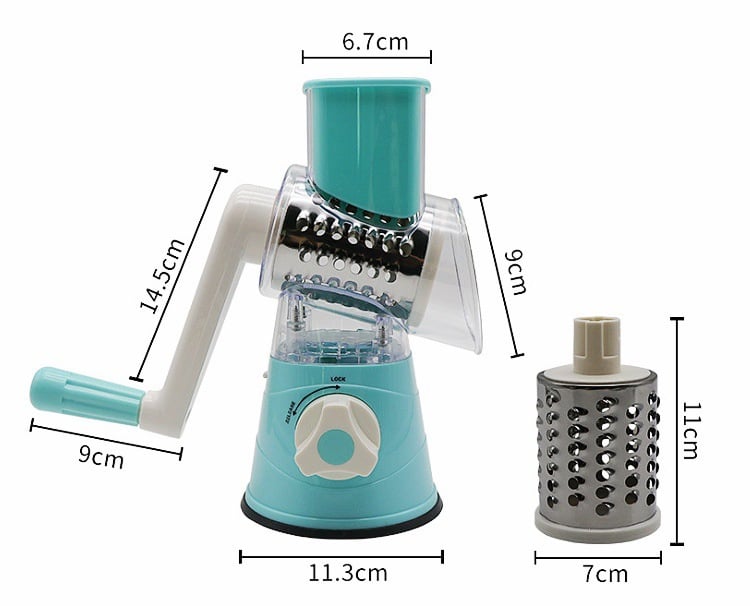 This new food grater and shredder speeds up chopping by 12 times, cutting prep time significantly. It includes 5 replaceable blades for slicing, shredding, and more—perfect for cheese, potatoes, zucchini, carrots, cucumber, and chocolate. Easy to use with just a few turns of the handle, it handles various cuts swiftly.