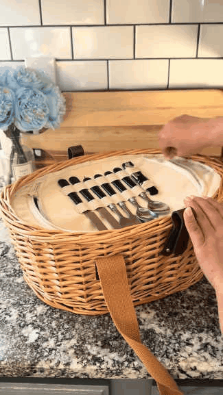🖼️This is not a simple classic picnic basket, it’s a complete picnic set with everything for outdoor picnic date on the go: 1 hand woven wicker picnic basket with strong canvas handle + 1 little size solid wood handmade foldable picnic table + 1 large insulated cooler bag + 4 sets cutlery service kits ,Including 4 X Stainless steel tableware (knife, fork and spoon), 4 X plastic wine glasses, 1 X waiter style bottle opener, 1 X salt & pepper shaker.