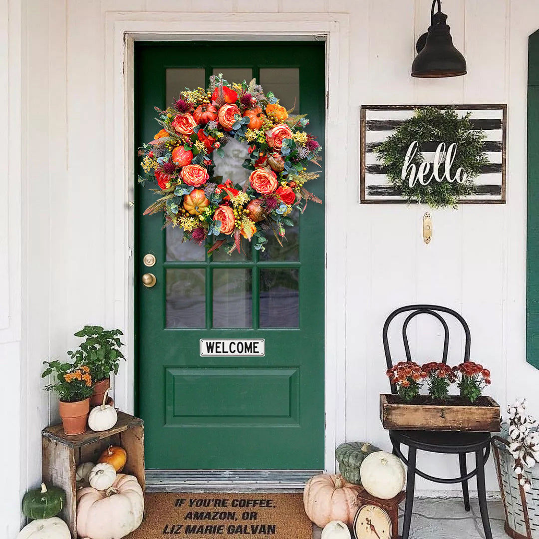 💖This lovely farmhouse style pumpkin door hanger will look lovely gracing your front door this fall!Use this faux peony pumpkin wreath to say "Welcome to our home" throughout the season.💖Enjoy this beautiful, deluxe wreath for years to come! Welcome your guests with this stunning Forever autumn pumpkin wreath.