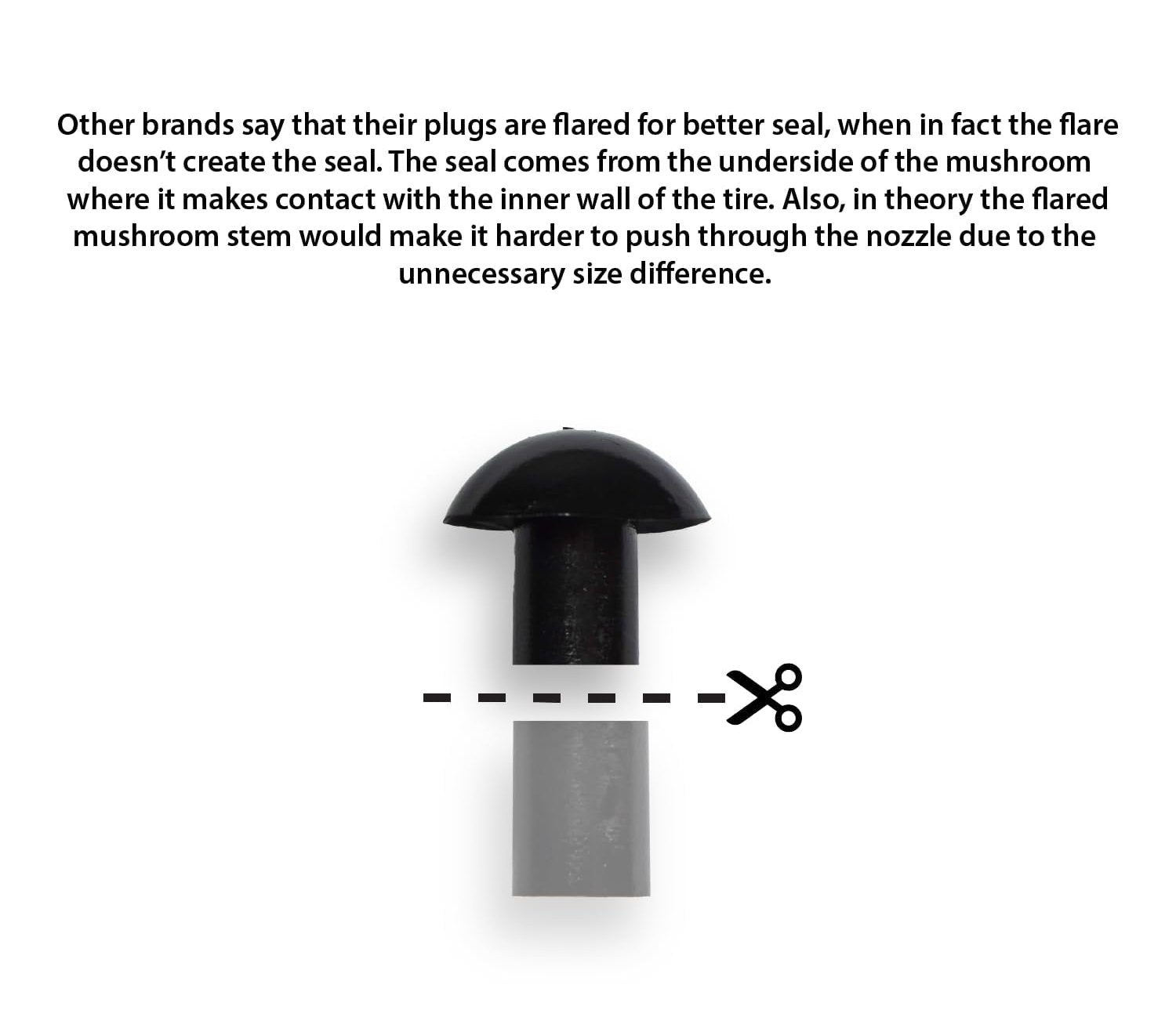 Mushroom-shaped plugs provide the ultimate solution to all tubeless tire punctures. The mushroom plugs are made of a unique combination of rubber that does not wear out with time compared to conventional puncture strips.