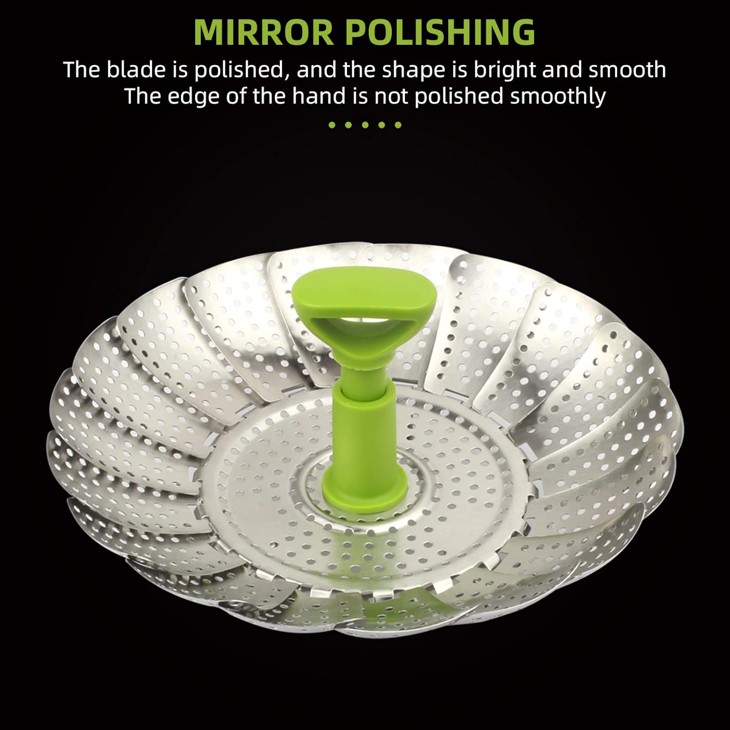 Space-saving: This steamer basket can be folded, saving storage space, and can be adjusted from 5.5 inches to 9 inches to fit different pot sizes. You can adjust the size of the steamer basket according to your needs to fit your cookware.